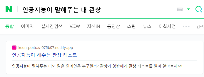 '일단 인공지능이 말해주는 내 관상' 으로 검색을 합니다. 그러면 바로 제일 상단에 '인공지능이 해주는 관상 테스트' 사이트가 뜨더라고요. 아래처럼 말이죠.