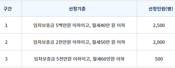 월세 및 임차보증금 기준을 3개구간으로 나누고 선정인원 초과시에 구간별로 무작위 추첨(전산) 5,000명